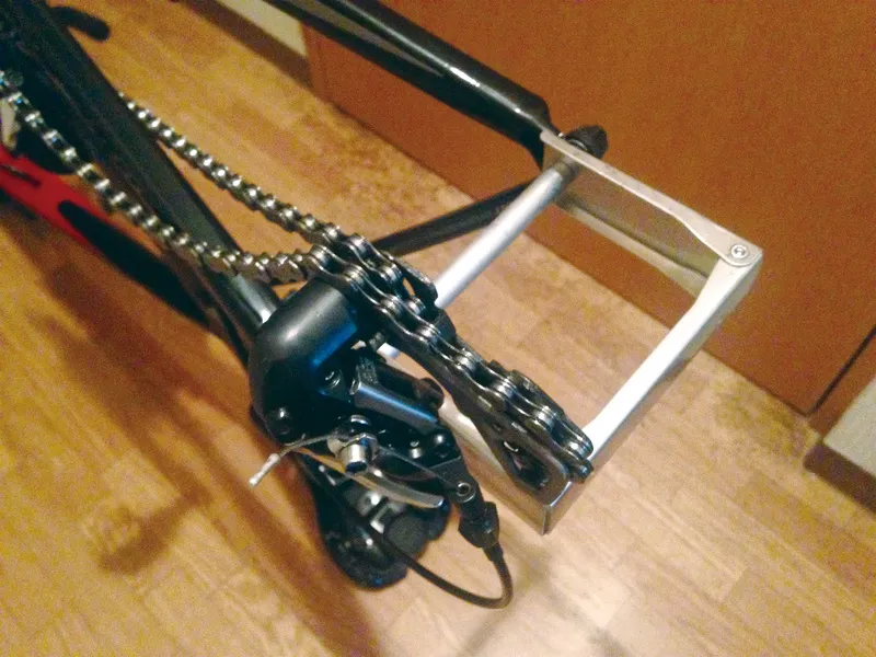 ディレイラーを内側に寄せて固定することで破損を防ぎます。